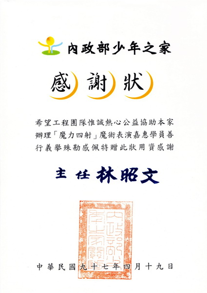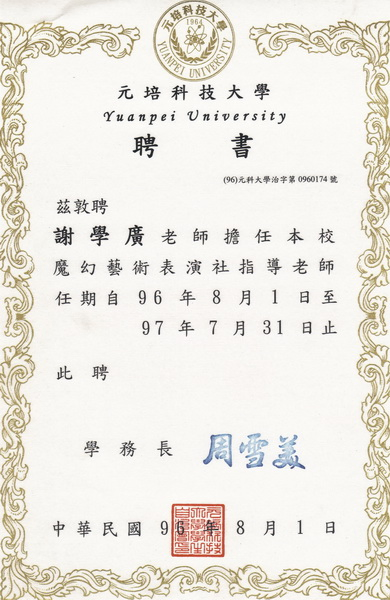 風城魔法學院 師資簡歷(1) 黑帽魔術協會會員心齋藝術學會 魔法講師風城魔法學院 魔術老師向陽中輟學園 魔術老師國立高雄餐旅學院 魔法講師旺宏電子魔術表演(近距離沿桌表演) 友達電子耶誕晚會魔術表演(近距離) 世界和平祈願會弱勢孩童 魔術表演仁愛啟智中心/愛心育幼院 魔術義演 德蘭孤兒院 魔術表演義賣活動新竹縣政府聘請演出 (新竹縣政府廣場) 向陽基金會中輟生 魔術課程編排清華大學知識嘉年華 魔術表演編排社大全國優良課程推薦(表演藝術魔術篇) 新竹縣政府 94 學年度模範兒童表揚活動 (94.04.01) 新竹縣政府 // 魔術變變變 94年優質兒童成長體驗營 魔術指導老師世界和平祈願會冬令營教學 2005.1.30 新竹地方法院少年感化院 2005.4.15 新竹市老人社區 / 新竹縣兒少支援中心 勞工局夏令營 魔術社指導老師中央警察大學 魔術社團指導老師新竹縣市救國團 魔術社團指導老師長頸鹿美語 魔術社團指導老師格蘭英文 魔術社團指導老師二重國小 魔術社團指導老師舊社國小 魔術社團指導老師磐石國中 魔術社團指導老師建功國中 魔術社團指導老師竹光國中 魔術社團指導老師育賢國中 魔術社團指導老師楊梅國中 魔術社團指導老師光華國中 魔術社團指導老師新竹高工 魔術社團指導老導老師曙光女中 魔術社團指導老師忠信高中 魔術社團指導老師義民高中 魔術社團指導老師磐石高中 魔術社團指導老師湖口高中 魔術社團指導老師竹北高中 魔術社團指導老師二重國中 魔術社團指導老師竹東高中 魔術社團指導老師南華國中 魔術社團指導老師博愛國小 魔術社團指導老師松林國小 魔術社團指導老師 承德國中 魔術社團指導老師橫山國中 魔術社團指導老師竹東國中 魔術社團指導老師實驗國中 魔術社團指導老師新湖國中 魔術社團指導老師松林國小 魔術社團指導老師茄苳國小 魔術社團指導老師自強國中 魔術社團指導老師實驗高中 魔術社團指導老師湖口國中 魔術社團指導老師新科國中 魔術社團指導老師虎林國中(暑期夏令營) 魔術社團老師 虎林國小(課後安親) 魔術社團老師竹北國中 高關懷魔術社團指導老師竹科科技生活館 魔術指導老師竹科幼兒園 魔術社團指導老師苗栗聯合大學 魔術社團指導老師元培科技大學 魔術魔術社團指導老師明星科技大學魔術學分班 魔術代課老師竹北社區大學 魔術社團指導老師新竹縣市幼稚園安親班 魔術指導老師竹北中華電信 舞台魔術指導老師明星科技大學 魔術社團指導老師大華技術學院 舞台魔術指導老師夏恩英文文教連鎖 魔術指導老師童話森林文教連鎖機構 魔術指導老師台積電(新竹科學園區) 魔術指導老師全懋科技(建教班) 魔術指導老師啟碁科技(科學園區) 魔術指導老師銥鋇文教機構 魔術指導老師英格蘭英語連鎖機構 魔術指導老師新竹縣關懷貧弱家庭兒童愛心慈善義演會弋果美語 魔術課程老師竹北 YOYO 寶貝營 魔術指導老師勞工局 勞工子女 暑期夏令營佛利斯特幼兒園 魔術教學老師人權協會 魔術教學老師加貝安親班 魔術教學老師雙園補習班 魔術教學老師中華兒童 魔術教學老師矽谷小學 魔術社團教學老師竹科緯創力行廠 魔術教學老師竹科緯創新安廠 魔術教學老師竹科緯創 舞台魔術表演巧苑工坊 魔術指定老師新竹稅務局 魔術指導老師新竹西門 寶貝營 魔術指導老師竹塹小姐 舞台魔術指導老師華岡藝校年度術科招考 舞台魔術指導老師財政部「稅務尖兵魔術夏令營」 魔術指導老師環宇電台 暑期夏令營 魔術指導老師台積電八廠 魔術指導老師台積電二廠 魔術指導老師台積電園遊會 舞台魔術指導老師佛利斯特 魔術指導老師交通大學聯合慈善魔術晚會 贊助廠商新豐國中 魔術社團指導老師成功國中 魔術社團指導老師新竹附小 魔術社團指導老師幼發拉底 魔術指導老師枋寮國民小學 魔術社團指導老師竹北故事屋 魔術指導老師實驗雙語部 魔術指導老師台北世貿 舞台魔術表演大華技術學院 魔術指導芝麻街美語 舞台魔術表演忠信高中建教班 魔術指導老師勞工局夏令營 魔術指導老師大華技術學院運動會 舞台魔術表演 芎林鄉社區 舞台魔術演出台中世貿舞台 魔術招生演出新竹科學園區(科技生活館) 魔術表演救國團團慶 舞台魔術演出竹北蔚藍海社區 舞台魔術表演竹北豐爵社區 舞台魔術表演竹北小太陽幼稚園 魔術演出新竹竹光國中 舞台魔術表演竹東二重國小 舞台魔術表演新竹磐石高中 舞台魔台魔台魔術表演竹北圖書館 舞台魔術演出楊梅揚昇高爾夫球場 魔術表演新竹神呼奇指安親班 魔術表演萬碁科技 尾牙魔術表演新竹港南育樂中心 舞台魔術表演竹北中華電信 舞台魔術表演竹北喜宴--大光明餐廳 舞台魔術表演忠信高中除夕跨年晚會 舞台魔術表演新竹華麗雅緻結婚喜宴 舞台魔術表演新竹高工園遊會 舞台魔術表演凱薩飯店 舞台魔術表演曙光女中 舞台魔術演出社團指導老師台積電八廠 舞台魔術表演 東門國小 舞台魔術表演 亞太廣播電台(FM-92.3) 魔術專訪環宇廣播電台(FM-96.7) 魔術專訪中華電信尾牙 舞台魔術表演誠正中學 舞台魔術表演向陽中輟學園 魔術社團指導老師明星科技大學 魔術社團指導老師元培科技大學 魔術社團指導老師苗栗聯合大學 魔術社團指導老師竹北社區大學 魔術社團指導老師明星科技大學魔術學分班 魔術代課老師竹北社區大學 魔